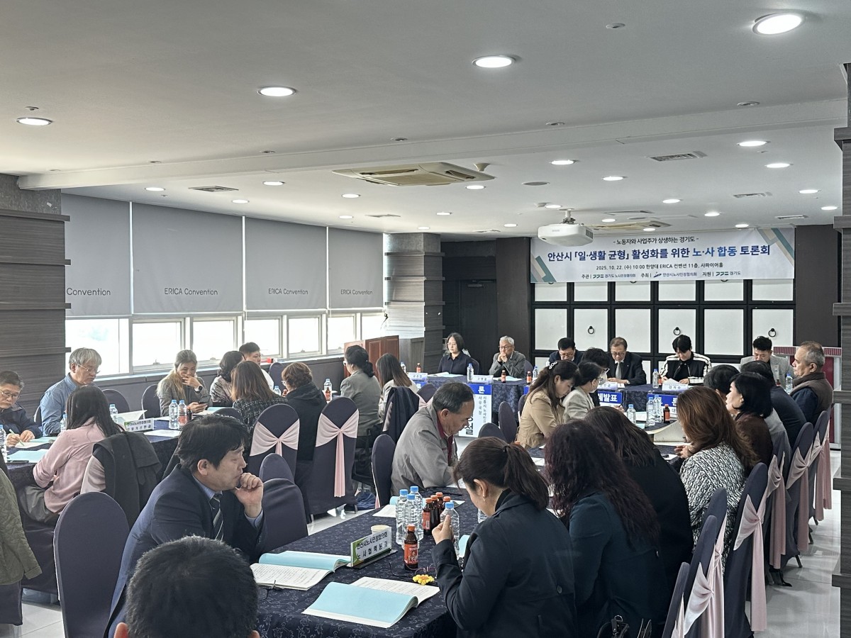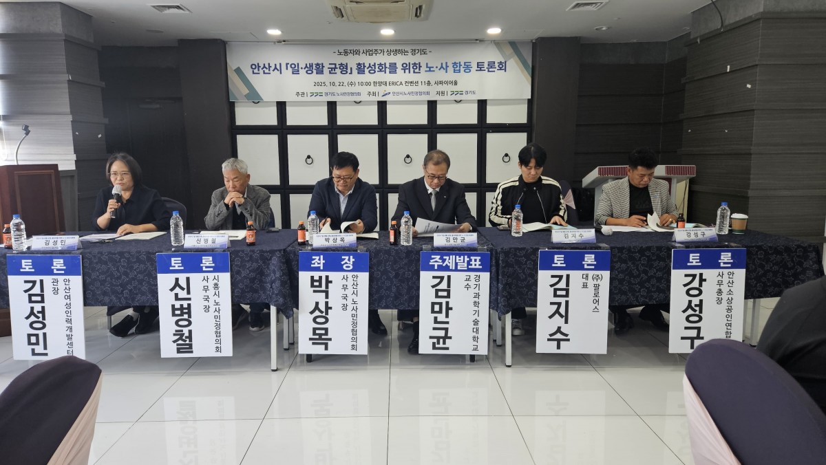 경기도 노사민정협의회와 안산시 노사민정협의회가 22일 한양대학교ERICA캠퍼스 11층 사파이어홀에서 "2025년 일·생활 균형 활성화를 위한 노·사합동 토론회" 를 개최하여 안산시의 일·생활 균형 활성화에 대해 논의했다.