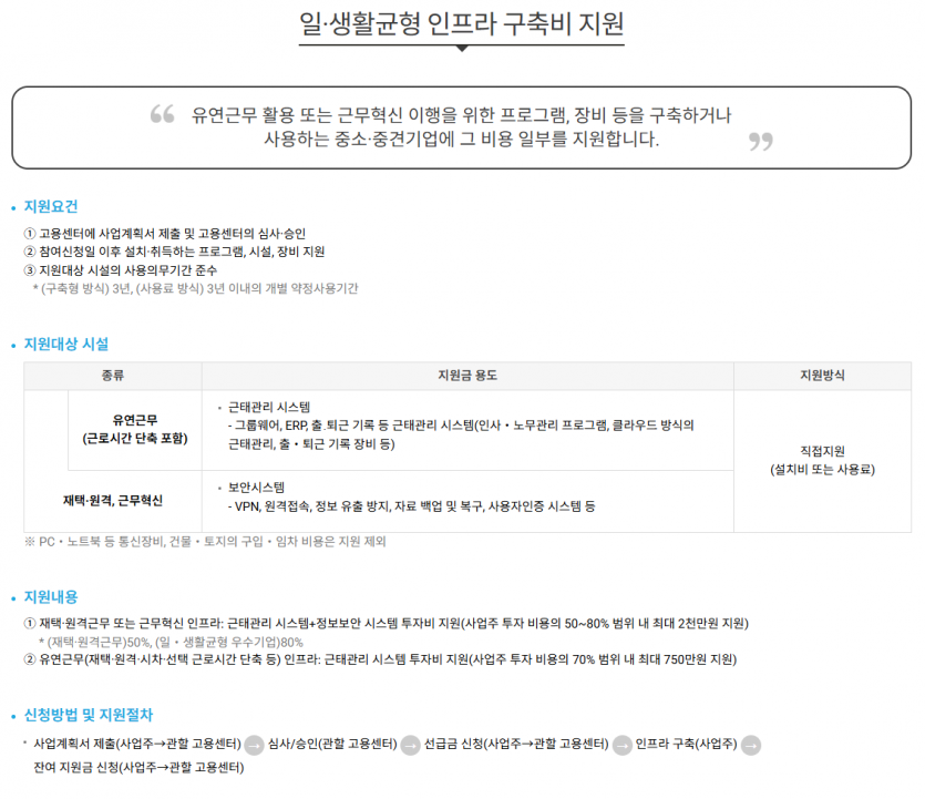 - (유연근무) 근태관리 시스템 지원 : 그룹웨어, ERP, 출·퇴근 기록 등 근태관리 시스템, 기업 전용 이메일·메신저, 서버, 스토리지, 업무용 소프트웨어 등