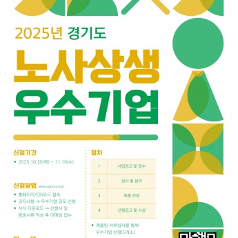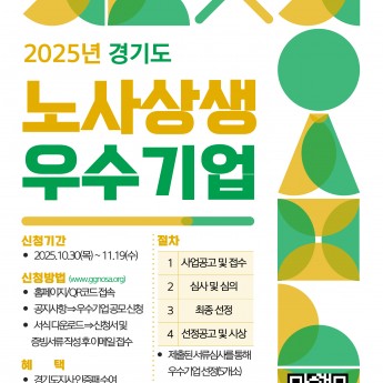경기지역 내 우수사례 확산을 도모하고자 다음과 같이 2025년도 경기도 노사상생 우수기업 선정을 공모하오니 도내 중소‧중견기업 기업께서는 많은 참여 바랍니다.