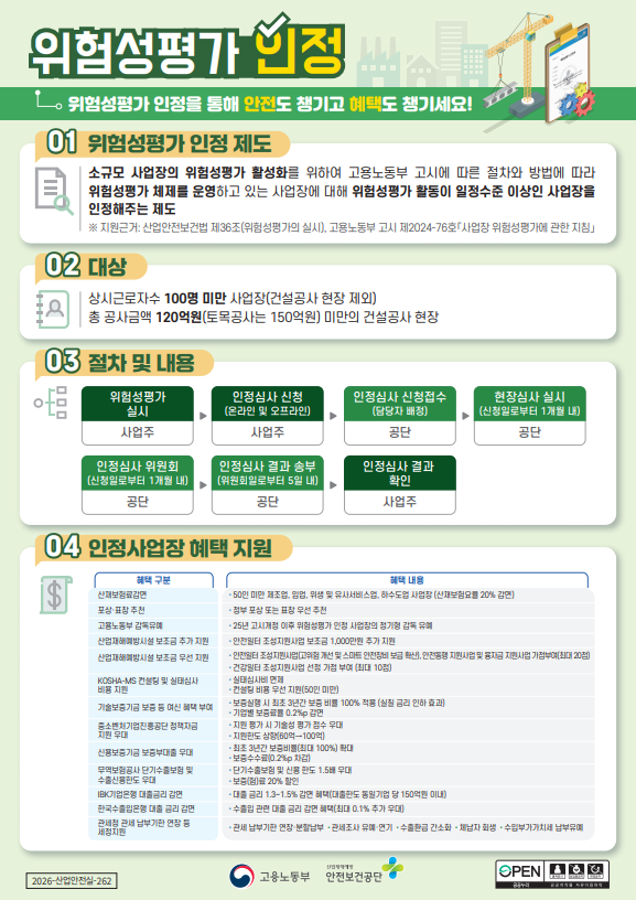 - 소규모 사업장의 위험성 평가 활성화를 위하여 고용노동부 고시에 따른 절차와 방법에 따라 위험성 평가 체제를 운영하고 있는 사업장에 대해